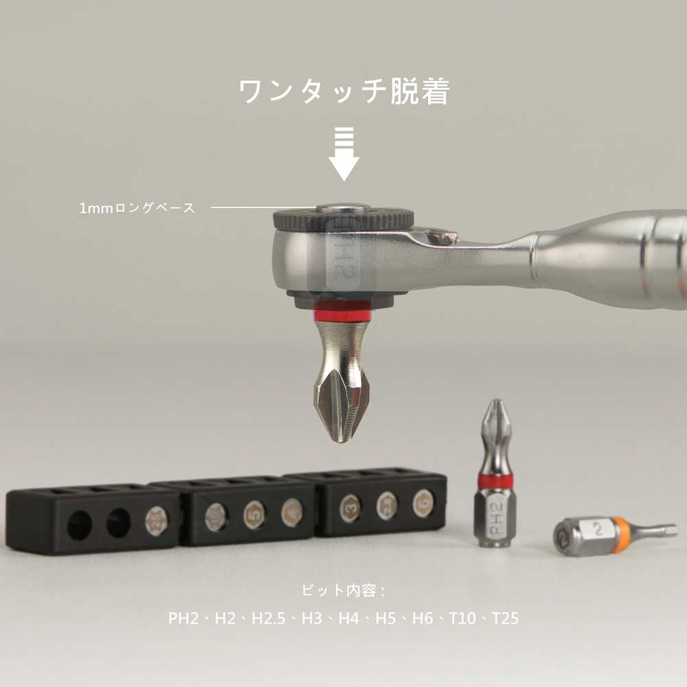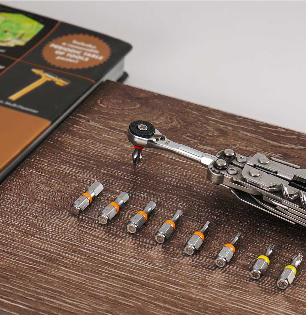 711L EDCツールの大きな強みのひとつは、カスタマイズ可能な接続方法が豊富にあることです。必要なトルクを調整し、自分だけのツールセットを作成できます。例えば、1/4インチラチェットをYドライバーに取り付け、そのYドライバーに作業に適した1/4インチビットをセットできます。また、ラチェットをロリポップに装着することで、より高い機械的アドバンテージと安定したグリップを得ることができます。さらに、磁石は自動的に調整され、どのツール先端にもスムーズに取り付け可能です。