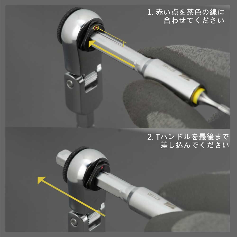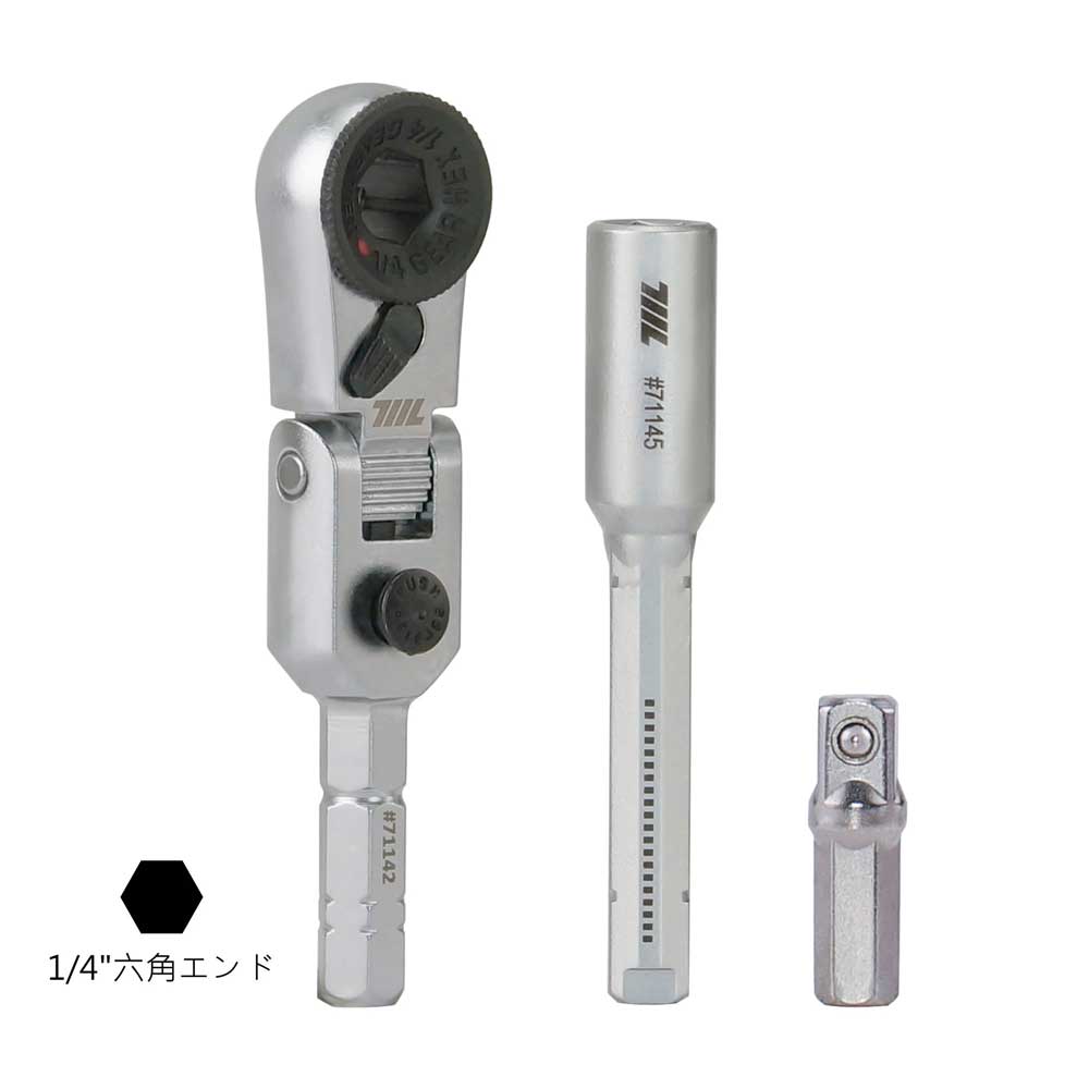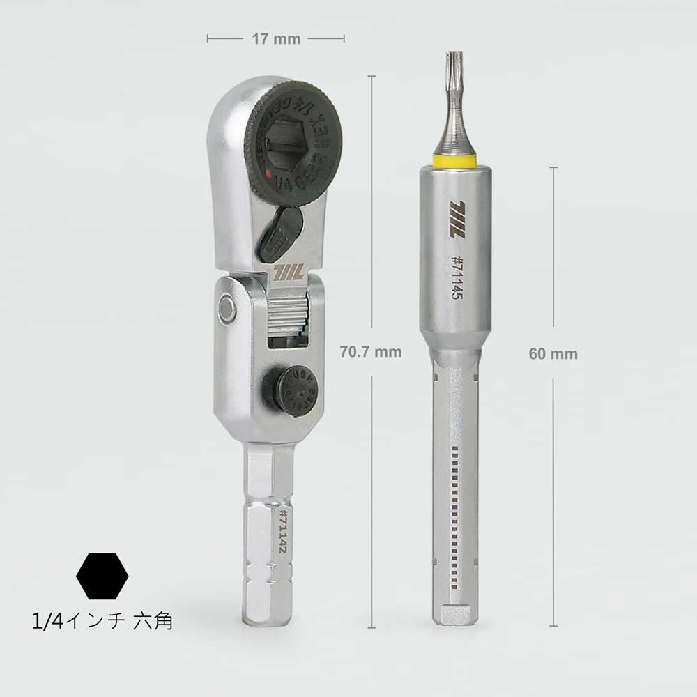 Tハンドルデザイン、フレックスヘッド機構、1/4″六角ビットとフリップソケットに対応したポケットサイズのラチェットレンチ。